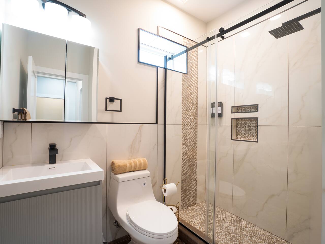 Reaching Manhattan couldn’t be easier — a bus stop just steps away offers a direct 15-minute ride to Port Authority Bus Terminal in Times Square. Prefer the water? The NY Waterway ferry terminal is a short drive away and offers scenic rides across the Hudson. Rideshares and taxis are readily available, and Newark Airport is about 25 minutes by car. Free street parking is available in the neighborhood, though spots can be limited at peak times.