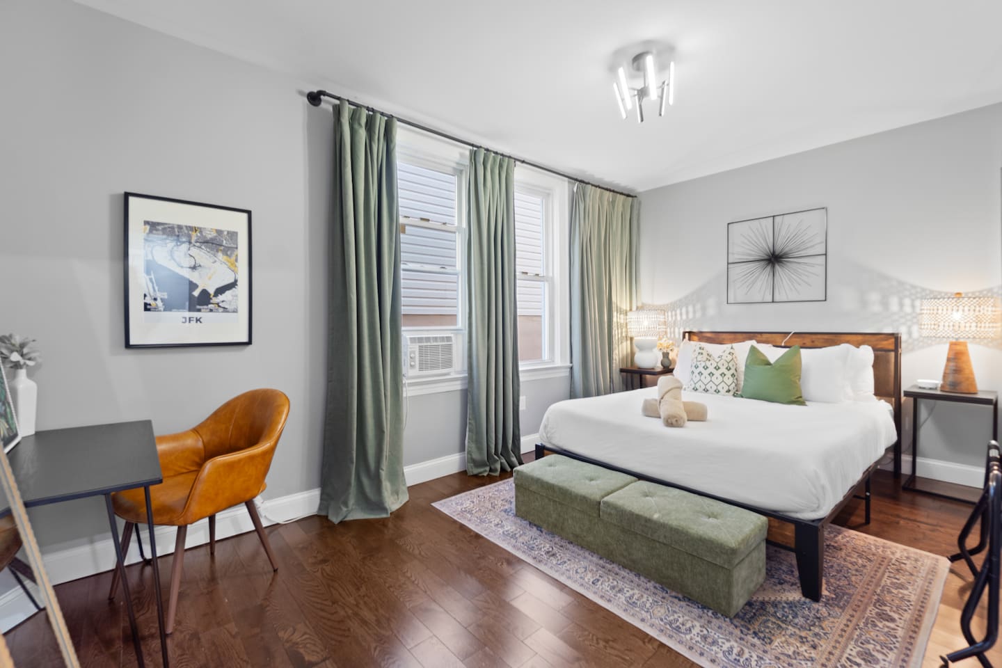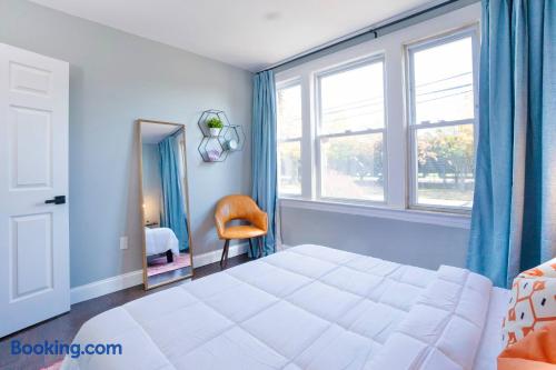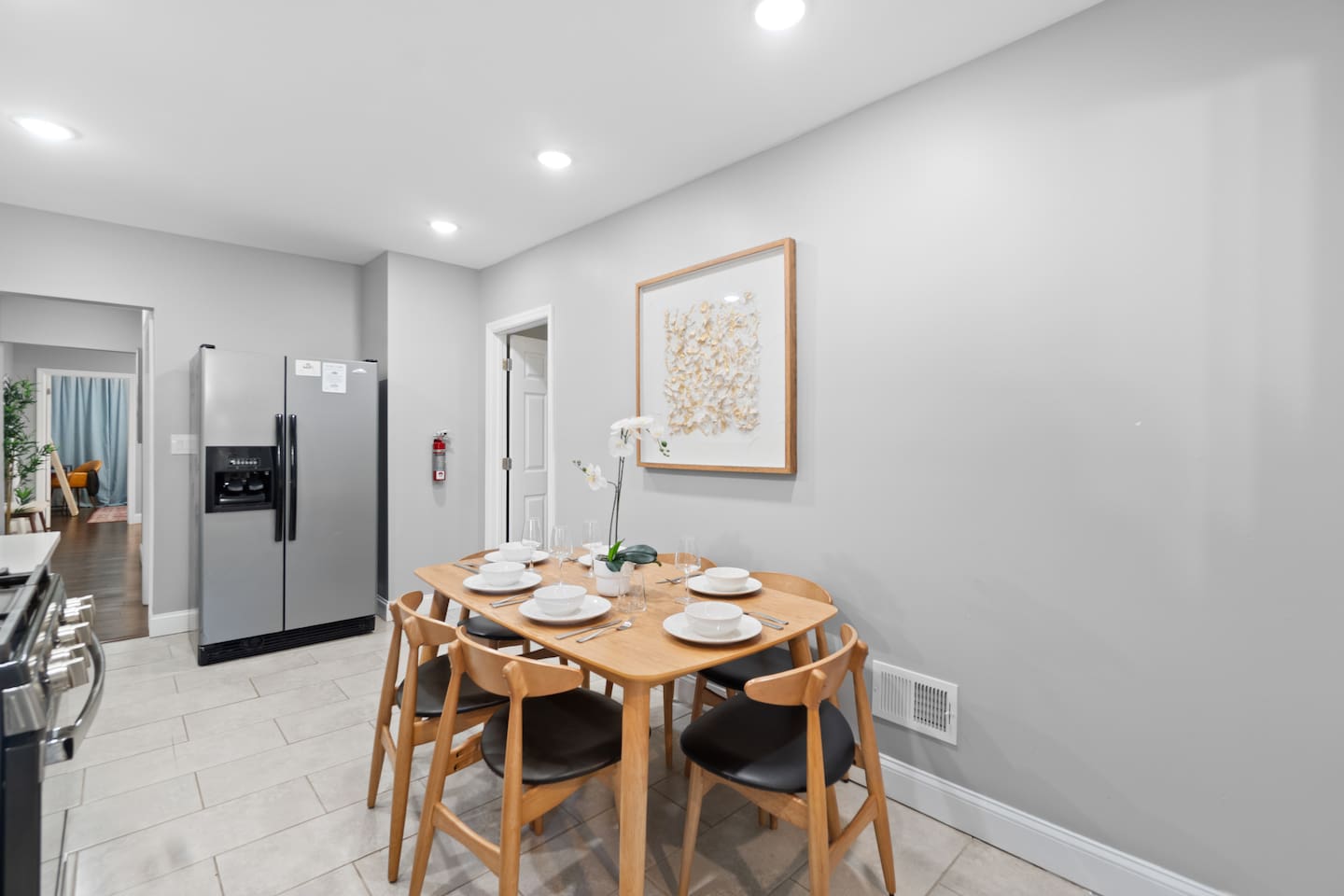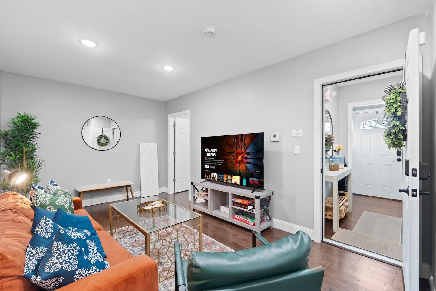 Soft winter air settles over Newark as you step into a calm, welcoming space designed to give you room to breathe between busy days in the city. The single level layout keeps everything easy to access, while the warmth inside makes returning from cold streets or evening commutes feel grounding. Whether you're preparing for a day of transit into New York or settling in after exploring local neighborhoods, the home offers a steady place to unwind. Sleeping arrangements Three private bedrooms provide comfortable space for up to 8 guests. One bedroom includes a queen bed, another offers a queen bed alongside a double bed, and the third features a queen bed. Room-darkening shades, bed linens, extra pillows and blankets, and clothing storage help create restful nights and unhurried mornings, supported by a quiet setting that eases winter travel. Kitchen and dining The kitchen gives you the flexibility to prepare meals or keep simple snacks close at hand. A dining table creates a natural gathering point where you can share breakfast before catching the train, enjoy relaxed dinners, or organize plans for the day ahead. With everything within reach, daily routines feel smooth and familiar. Living and comfort After time spent outdoors or navigating cold weather, the living area offers a comfortable retreat. An HDTV and books provide options for quiet evenings, while Wifi and a dedicated workspace support remote work or trip planning. Air conditioning, ceiling fans, and heating allow you to maintain an ideal temperature throughout your stay, and the single level home with no stairs keeps movement easy for every guest. Bathroom essentials A bathroom with a bathtub and bathroom essentials offers the comforts needed for simple daily routines. Hot water makes morning preparations or evening wind-downs feel more relaxed during the colder months. Family-friendly details Guests traveling with children will find added conveniences such as a crib, a pack 'n play/travel crib, a folding or convertible high chair, children's dinnerware, and board games. These thoughtful features help families settle in quickly and comfortably. Access, parking, and safety A private entrance and self check-in with a smart lock make arrivals straightforward. Free parking on premises and free street parking add flexibility, whether you're driving in or renting a car. Exterior security cameras on property, along with a smoke alarm, carbon monoxide alarm, fire extinguisher, and first aid kit, support peace of mind throughout your stay. Neighborhood and getting around Set within an urban Newark neighborhood, the home places you close to grocery stores, parks, cafes, and cultural attractions. Broad Street, the Prudential Center, and major transit options such as Newark Penn Station and Washington Street Station offer easy access to New York City and surrounding areas. Newark Liberty International Airport is only a short drive away. Perfect for This pet-friendly home works well for families, friends, colleagues, or long term stays allowed of 28 days or more. With a grounded atmosphere and practical amenities, it serves as a comfortable winter base for exploring Newark, attending events, or commuting into the city.